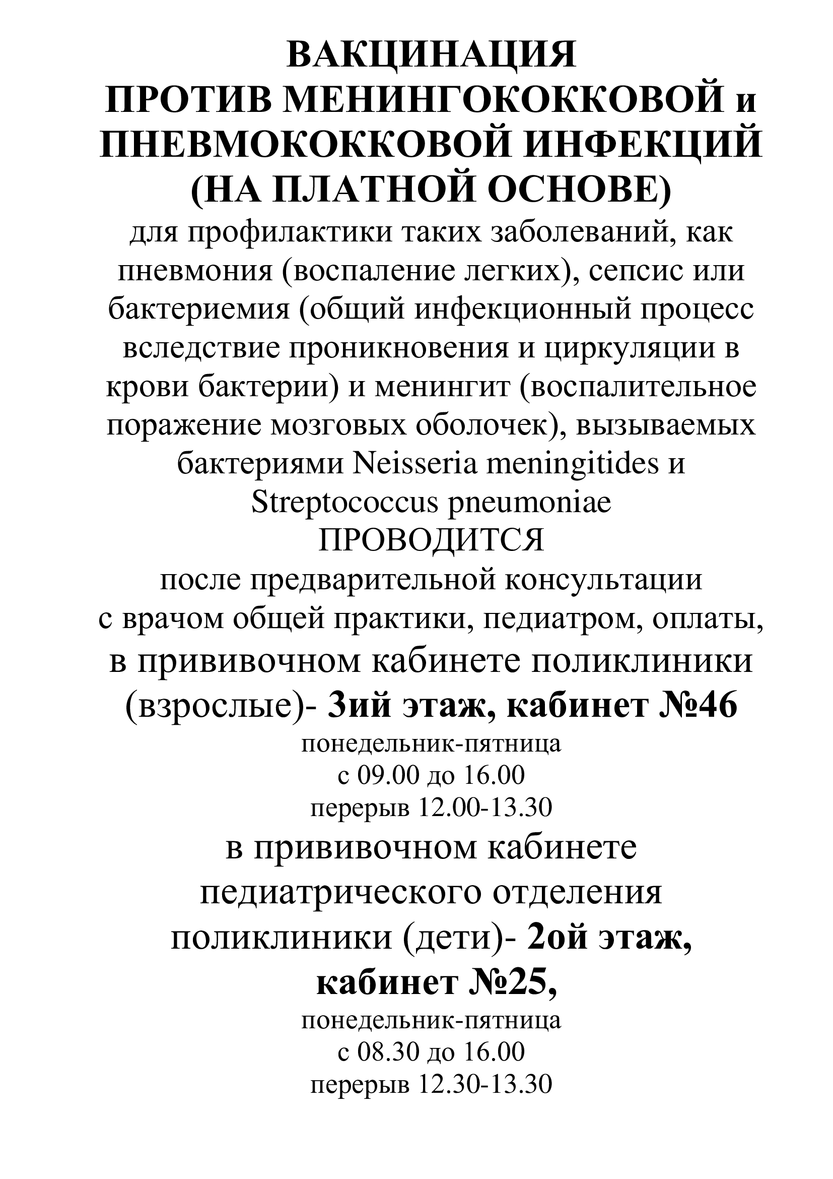 Вакцинация против менингококковой и пневмококковой инфекций (на платной основе)